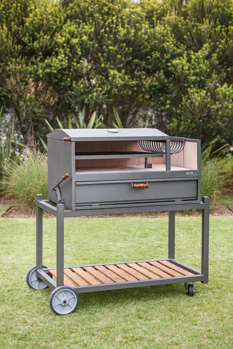 Tiene un original sistema de regulación de altura de la parrilla, una tapa ideal para hacer pizzas a la parrilla o para días ventosos y un cajón para poder guardar la pala, atizador o lo que se quiera.